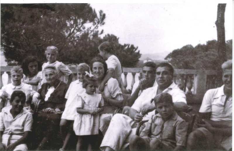 Josep M. Muñoz Arbat i Anna Casadevall Fuster amb els seus fills i familiars estiuejant a Platja d’Aró, 1947. [Josefina Muñoz Casadevall]