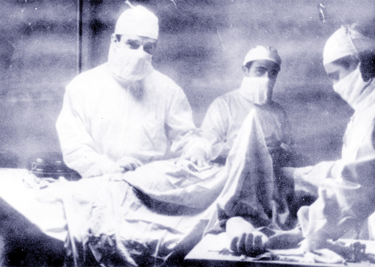Els primers dies dl cirurgià Julià Fuster Ribo, a l’esquerre, al quiròfan del camp de concentració de Kenguir, al Kazakhstan, c. 1949. [Arxiu R Fuster Ruiz]