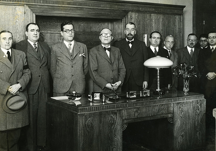 Ramon Barbat i Miracle, tercer a l’esquerra de la imatge, assumeix la conselleria reunificada de Sanitat i Assistència Social de la Generalitat de Catalunya en presència del conseller de Sanitat dimitit, Francesc Huguet i Puigderrajols, a l’esquerra de Barbat. Entre la resta, reconeixem el tisiòleg Lluís Sayé, quart a la dreta de la fotografia. Barcelona, 28 novembre 1935. [Foto C Pérez de Rozas | AFB]
