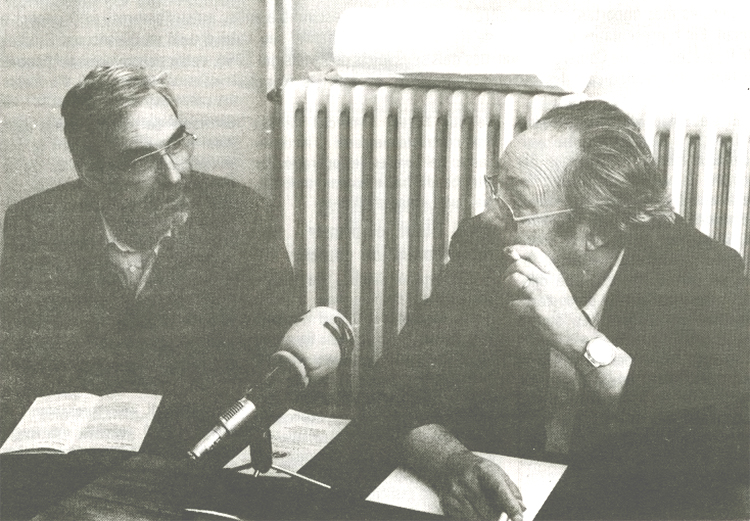 Acte de cloenda de les XVIII Jornades d’interès Psiquiàtric en què participa el psiquiatre reusenc Francesc Tosquelles Llauradó, a la dreta de la imatge. Reus, abril 1985. [Foto J Puig, ‘Reus’]