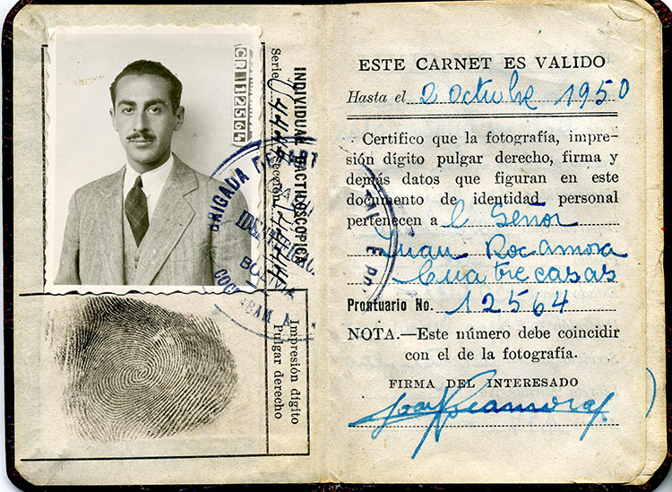 Cèdula d’Identitat i Estrangeria de Joan Rocamora Cuatrecasas, expedit per la República de Bolívia el 20 d’octubre de 1945 amb validesa fins al 1950. [Fons Joan Rocamora - Museu d'Història de la Medicina de Catalunya]
