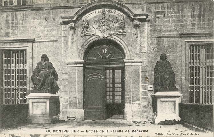 Porta d’entrada a la Facultat de Medicina de la Universitat de Montpeller, centre docent on, des del 1464, els estudiants matriculats gironins poden accedir-hi amb la beca que crea amb la seva lleixa el metge Joan Bruguera el 1452.