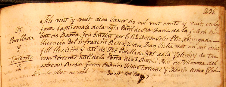Registre baptismal del futur metge Isidre Parellada i Torrents, batejat a la Parròquia de Santa Maria de la Geltrú el dia 28 de gener del 1808. [Arxiu Francesca Roig]
