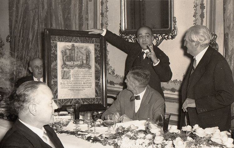 Amb motiu de la seva jubilació, el doctor Lluís Viladevall Matheu, dret de perfil amb el cabell blanc, rep l'homenatge dels seus companys de l'Hospital de Sant Jaume i Santa Magdalena de Mataró. Assegut al seu costat, el nou director mèdic Font Sastre. Dret i lliurant-li el diploma, el senyor Colomer, president de la Junta de l'Hospital. Mataró, 1958. [Arxiu Família Cusachs-Colomer]