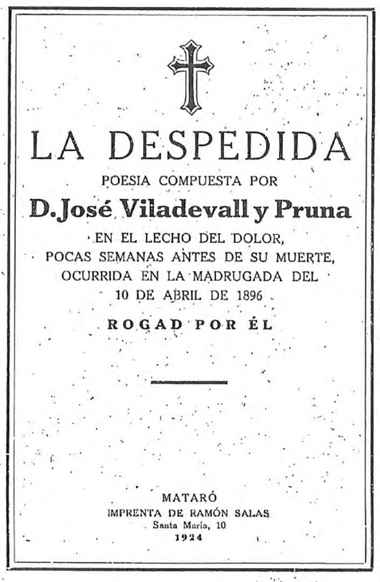 Edició del poema ‘La Despedida’, escrita pocs dies abans de morir el metge Josep Viladevall Pruna a Mataró el 10 d’abril del 1896 i impresa pòstumament l’any 1924.