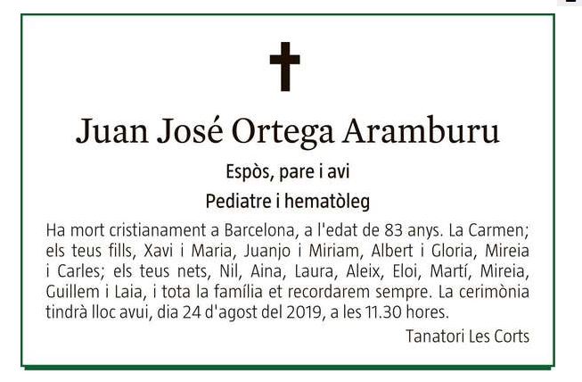 Esquela del Dr. Juan José Ortega Aramburu [Necrològiques, La Vanguardia 24 d’agost de 2019].