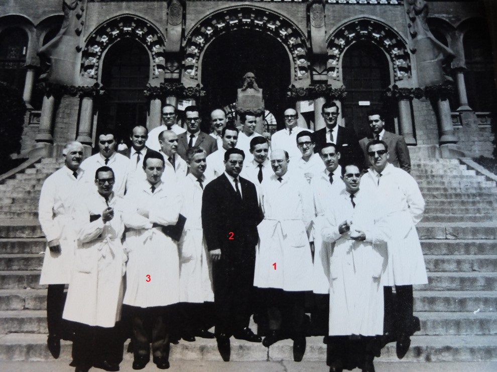 Curs de Cirurgia septo-piramidal a Bordeaux (França), amb els professors a la primera fila:G. Epiña (1) J. Iglesias (2), G. Migueis (3), l’organitzador del curs G. Guillen (4), J.M. Montserrat (5), G. Sulsenti (6) i J.M. Fabra (7), al voltant del 1970. [Dr. Montserrat Gili]