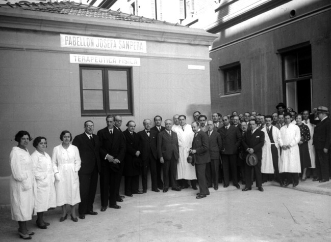 Inauguració del Pavelló Josefa Sanpera, benefactora de l’Hospital Clínic de Barcelona, en què reconeixem, entre d’altres assistents, davant i d’esquerra a dreta: els catedràtics Pere Nubiola, cinquè al davant i té a la seva esquerra Jaume Serra i Húnter, seguit de Jaume Peyrí Rocamora, Ferran Casadesús, Vicenç Carulla Riera –amb bata blanca- i Josep M Bartrina Thomàs –de costat amb el barret a la mà- i Lluís Suñé Medan, a l'esquerra de Bartrina. Hospital Clínic de Barcelona, 1932. [Fotògraf Branguli – ANC]