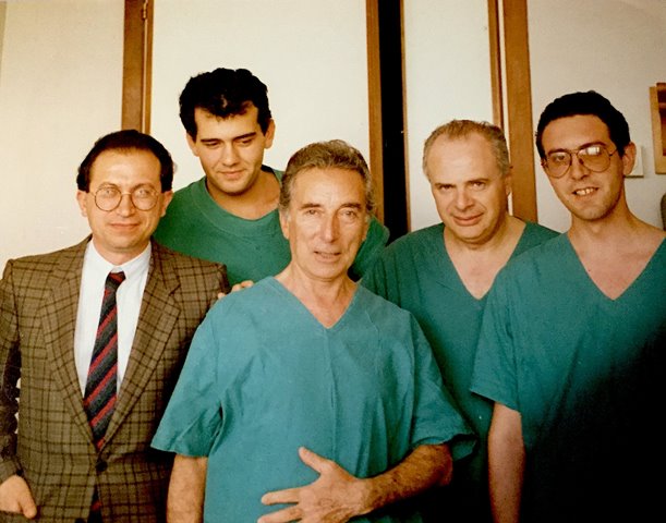El segon d’esquerra a dreta els professors G. Carriere, J.M. Gil-Vernet Vila, F.P. Selvaggi i el doctor J.M. Fidalgo. A Bari (Itàlia), abril de 1988. [José María Gil-Vernet Sedó]