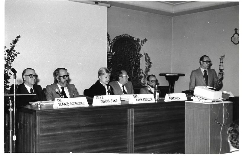 Presentació de Pere Miret al simposi sobre tuberculosi. D’esquerra a dreta els doctors Blanco Rodríguez, F. J. Guerra Sanz, Anne Rouillon, Pumarola i R. Cornudella Mir, 1980. [Família Miret Serra]