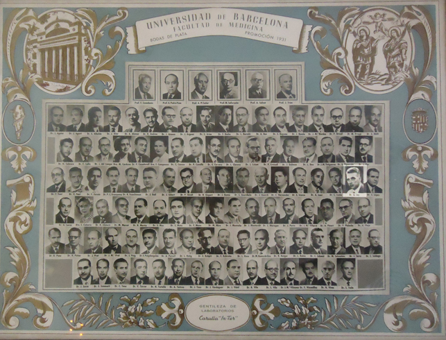 Orla de les noces d’argent de la Promoció de 1931 de la Facultat de Medicina de Barcelona. Adolfo Ley figura el segon a la dreta de la quarta fila. Barcelona, 1956. [Família Ley Valle]