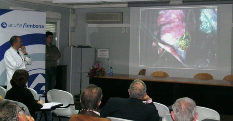 Imatge dels assistents a la projecció de la intervenció de l'equip de cirurgia toràcica del Joan XXIII en directe des de l’edifici de docència a Tarragona, 10 d’abril de 2010. [“Energia làser a sales d'operacions”. El Punt Avui, 10 d’abril de 2010]