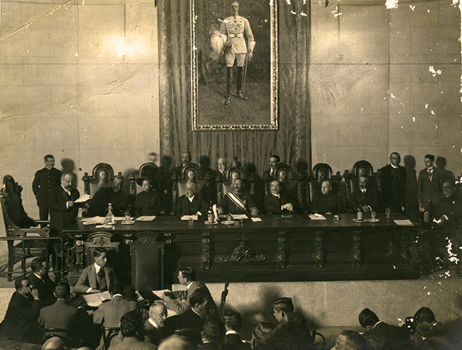 La imatge és testimoni del moment que Trinitat Sais Plaja llegeix el discurs inaugural del curs al Col·legi Oficial de Metges de Barcelona a l'antiga seu de Plaça Catalunya i la jove metgessa es converteix en la primera dona que fa una conferència a la corporació mèdica. Barcelona, 30 de gener del 1914. [Museu d’Història de la Medicina de Catalunya (MHM)]