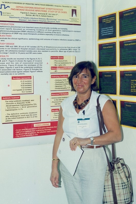 Mai Figueras presentant un pòster al Primer Congrés Mundial de Malalties Infeccioses Pediàtriques celebrat a Acapulco, 1996. [Àlex Pinós]