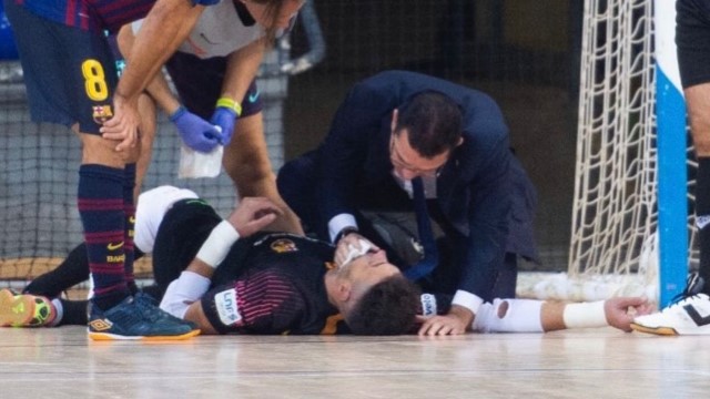 Carles Miñarro quan era metge de l’equip de futbol sala del Barça, aquí està atenent al jugador Juanjo. [Arxiu del FC Barcelona. ORM]