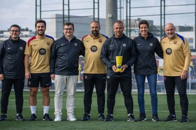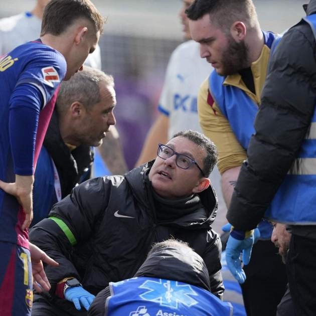 Carles Miñarro atenent un jugador durant un partit del Barça en la temporada 2025. [Agència EFE]