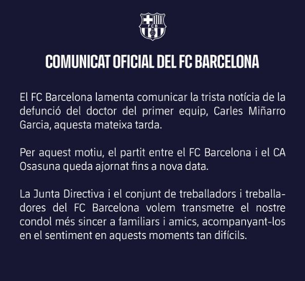 Comunicat oficial del FC Barcelona difós el 8 de març de 2025, en què el club anuncià la mort de Carles Miñarro, i l’ajornament del partit entre el FC Barcelona i el CA Osasuna. [Arxiu del FC Barcelona]
