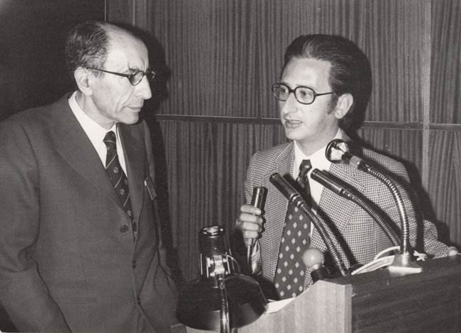 Els doctors Gubern Salisachs i Ruiz Companys conversen durant una conferència. C. 1975. [Família Gubern Pi]