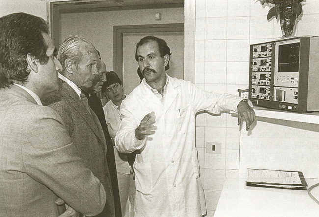 Àngel Rierola Isern assisteix a la inauguració de la remodelació de l’Hospital de Santa Creu de Vic que es fa a començaments de la dècada dels vuitanta. Entre d’altres, hi assisteixen els doctors Alcubierre, Roca, Marian Rovira, Sala Solé, Lluís Daufí, Montanyà, Abel Hernández i Josep Molera. Reconeixem, a l’extrem esquerre, Manuel Miserachs i, a l’extrem dret, el pediatre Martí Carbonell. Vic, principis dècada 1980. [Article de Marcel Coromines Balletbó. Dr. Àngel Rierola Isern. Un metge de la nostra terra. Gimbernat, 2005;43(1):241-57]