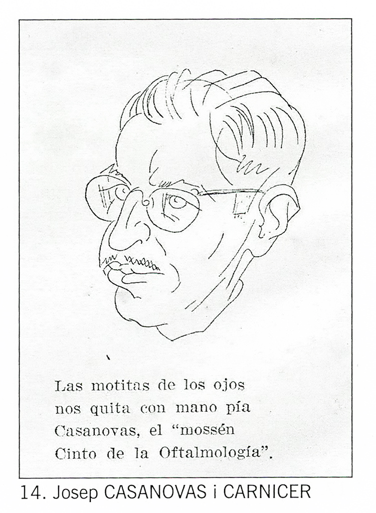 Josep Casanovas Carnicer és protagonista d’una de les seixanta-dues caricatures dels metges que assisteixen als actes del 25 Aniversari de la Promoció Mèdica del Curs 1927 de la Universitat de Barcelona que se celebren el juny del 1952. El retrat es complementa amb uns versos humorístics que expressen la personalitat del personatge. Autors no identificats, ordre alfabètic en un fulletó de 40 pàgines enquadernat en tapa dura. [Gimbernat, 2017;68:125-52]