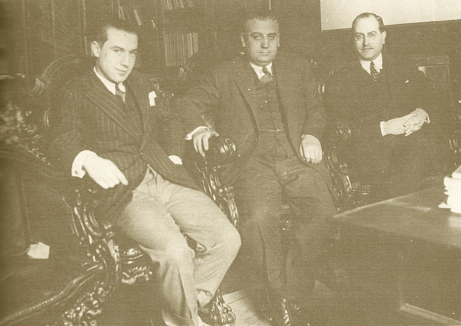 D'esquerra a dreta, Antoni Puigvert assegut al costat del mestre i cunyat, Manuel Serés. Amb ells, a la dreta de la imatge, el doctor Viusa. Barcelona, 1928. [ Dr. Antoni Puigvert. Mi vida ... y otras más, 1981 ]