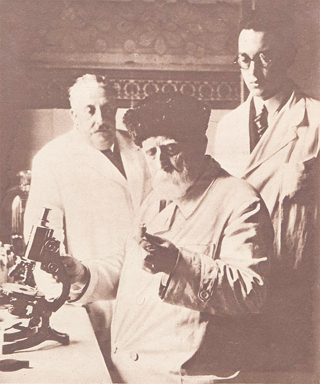 Fotografia d’una de les darreres recerques que fa el bacteriòleg Jaume Ferran Clua, amb l’assistència d’un ajudant no identificat i el seu nét Joan Vila Ferran, metge i farmacèutic continuador de la tasca investigadora del seu avi, publicada a 'Crónica'. Barcelona, c. 1929.