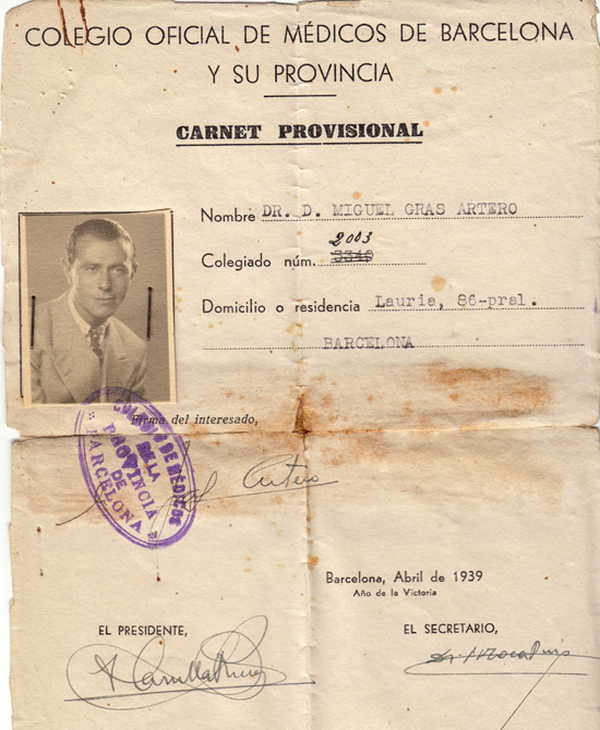 Carnet de col·legiat provisional del doctor Miquel Gras Artero. Barcelona, 1939. [Col·legi Oficial de Metges de Barcelona]