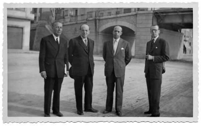 D'esquerra a dreta de la imatge, un comercial no identificat, l'oftalmòleg tortosí Antoni Oliveres Franquet, el seu gendre Vicent Beguer Piñol i Gerard Vergés Delsors, fill del cofundador dels Laboratoris Geve, Vergés & Oliveres. Tortosa, c. 1930. [Bama-Geve]