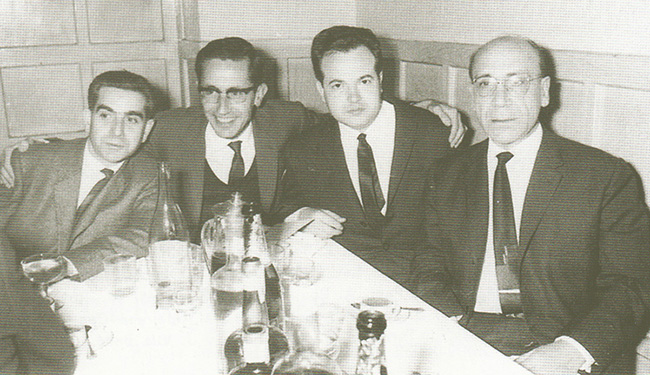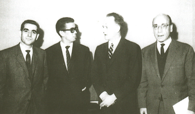 I Curs de Patologia del Sistema Nerviós, d’esquerra a dreta: Joan Solé-Llenas, Lluís Barraquer Bordas, Agustí Codina Puiggròs i Ramon Sales Vázquez, l’organitzador. Barcelona, novembre 1964. [Família Solé-Llenas]