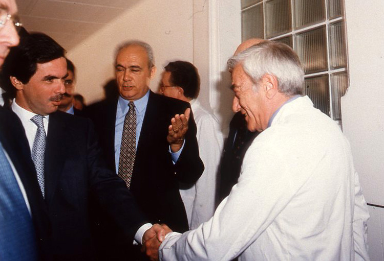 El cirurgià Josep Visa Miracle rep la salutació del president Aznar en presència del gerent de l’Hospital Clínic, Joan Grau. Barcelona, c. 2000. [Galeria de Metges Catalans]