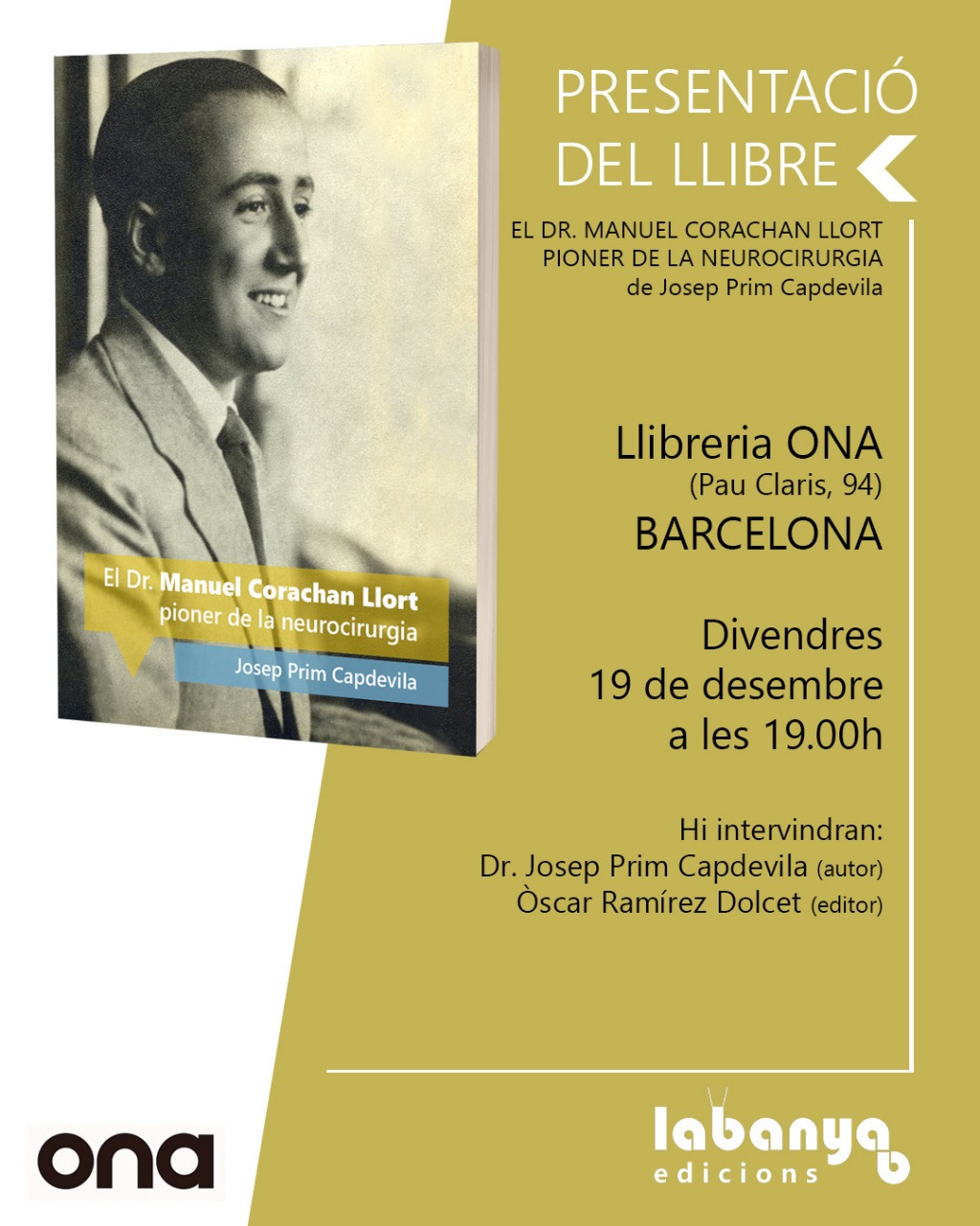 El llibre titulat “El Dr. Manuel Corachan Llort. Els inicis de la neurcirurgia a Barcelona” es presenta el divendres 19 a les 19.00 h a la Llibreria ONA de Barcelona.